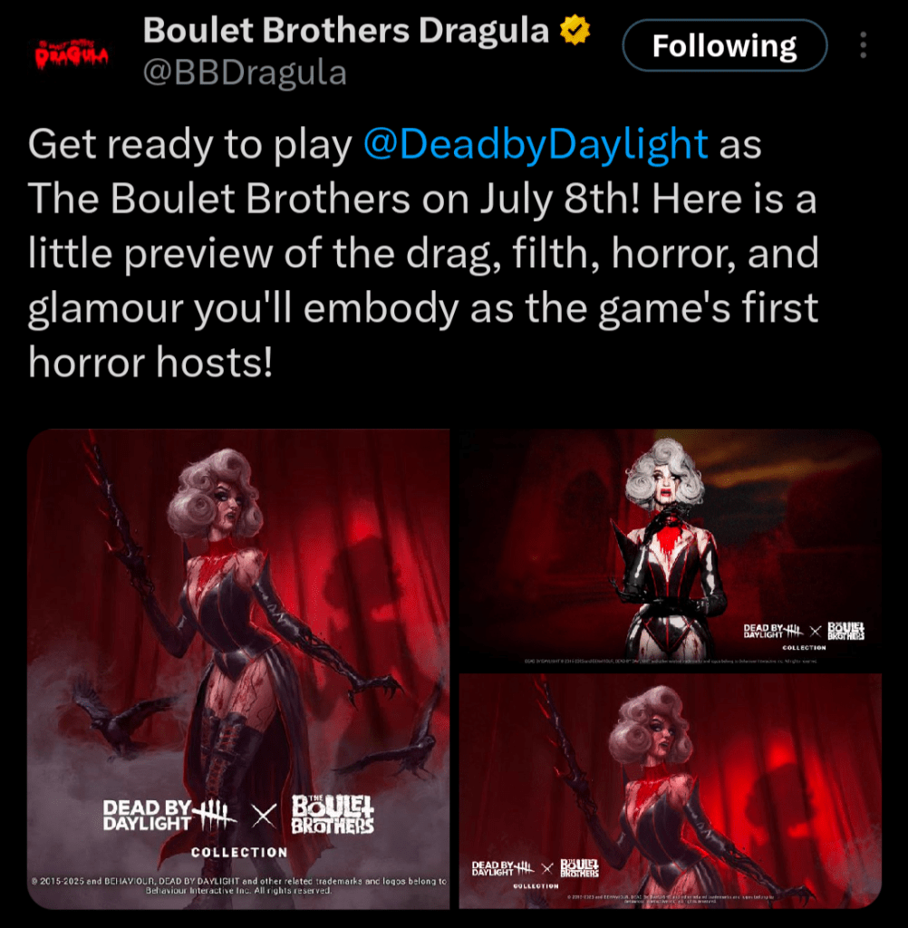 Be sure to check out Dragula on Shudder and AMC+! Also, check-out the skin on a Dead By Daylight when it is release on July 8th!